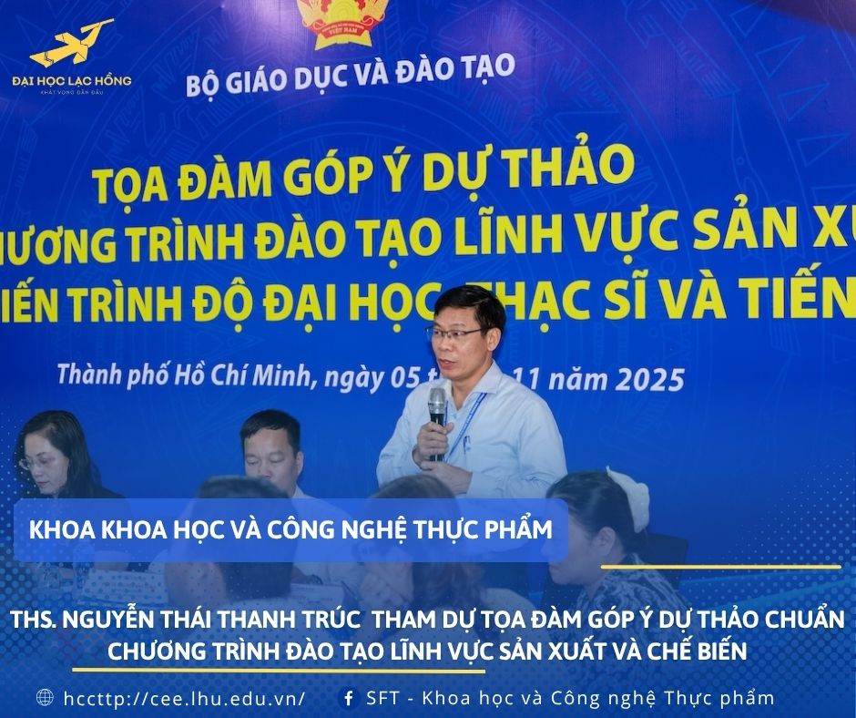 Tham dự buổi tọa đàm có PGS.TS. Nguyễn Anh Dũng – Phó Vụ trưởng Vụ Giáo dục Đại học, GS.TS. Trang Sĩ Trung, Chủ tịch Hội đồng thẩm định Chuẩn chương trình đào tạo, cùng lãnh đạo, chuyên gia và đại diện hơn 60 cơ sở giáo dục đại học trên cả nước. Đại diện Trường Đại học Lạc Hồng, ThS. Nguyễn Thái Thanh Trúc, Trưởng bộ môn Công nghệ thực phẩm, Khoa Khoa học và Công nghệ Thực phẩm đã tham dự và đóng góp ý kiến về chuyên môn.