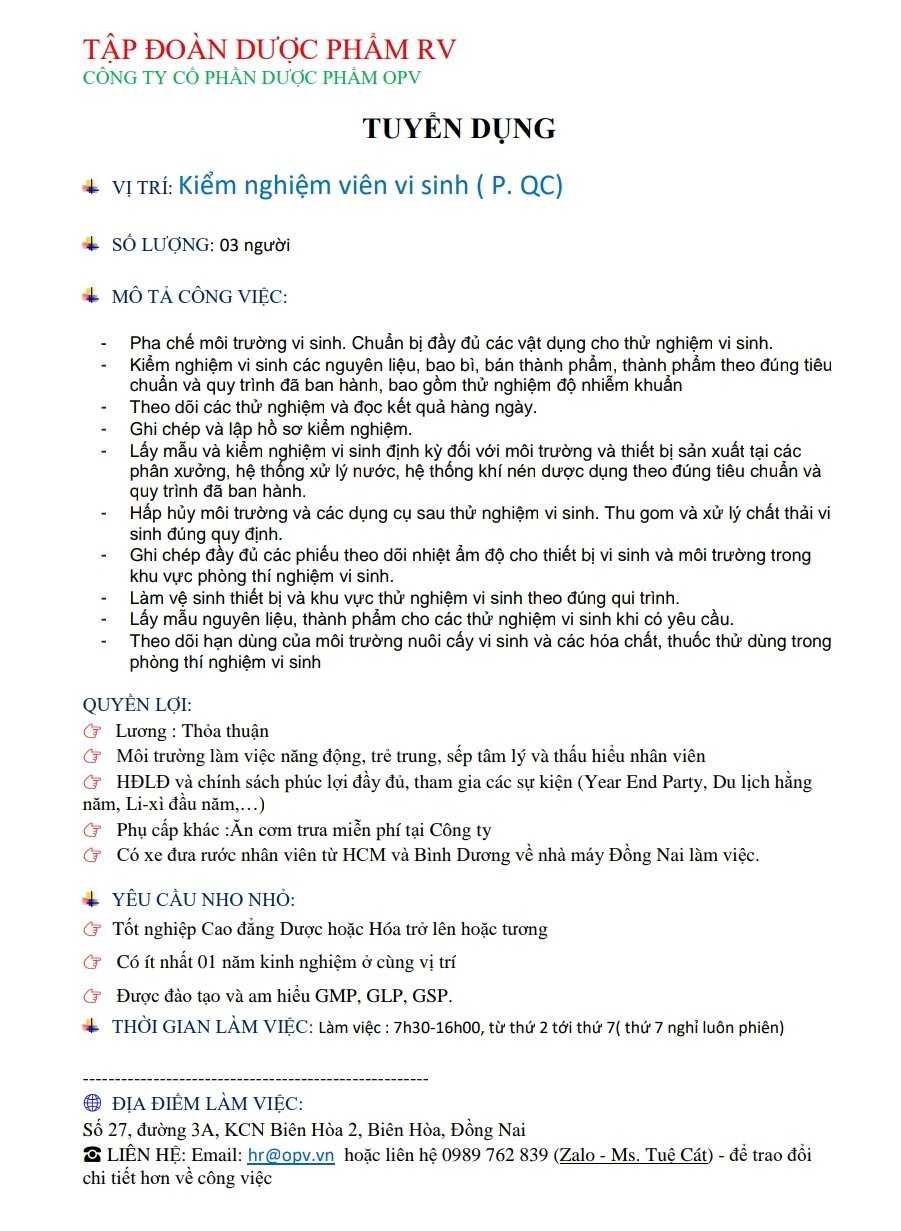 CÔNG TY CỔ PHẦN DƯỢC PHẨM OPV thông báo tuyển dụng nhân viên QC ngành Hóa, Dược