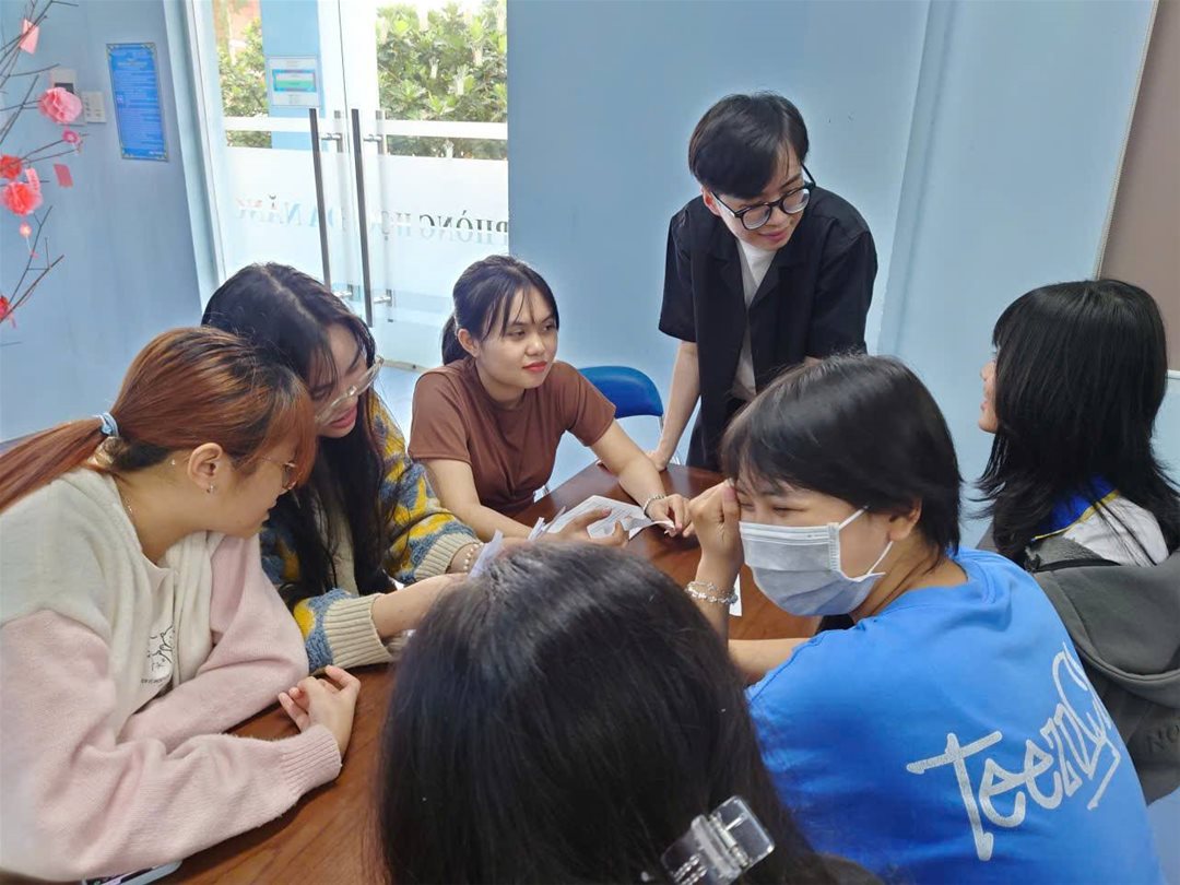 Không khí trở nên sôi nổi ngay từ đầu khi các bạn được chia nhóm nhỏ để trò chuyện về chủ đề "bạn thân" bằng tiếng Nhật. Vừa thân thiện, vừa giúp rèn luyện sự tự tin khi giao tiếp.